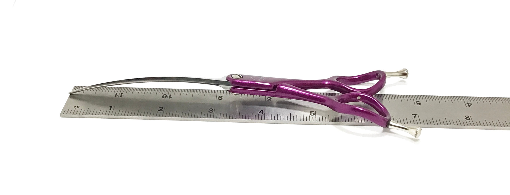 - 6.5” in length ( ruler pictures above). This style and size is what most groomers lack in their collection. Its difficult in a timely manner with excellent finish to achieve the Asian fusion face without this curve and size, Match the scissor and size to the dog and you will work faster and better plus less fatigue. The weight alone at the end of a long groom is a pleasant relief encouraging more detail.